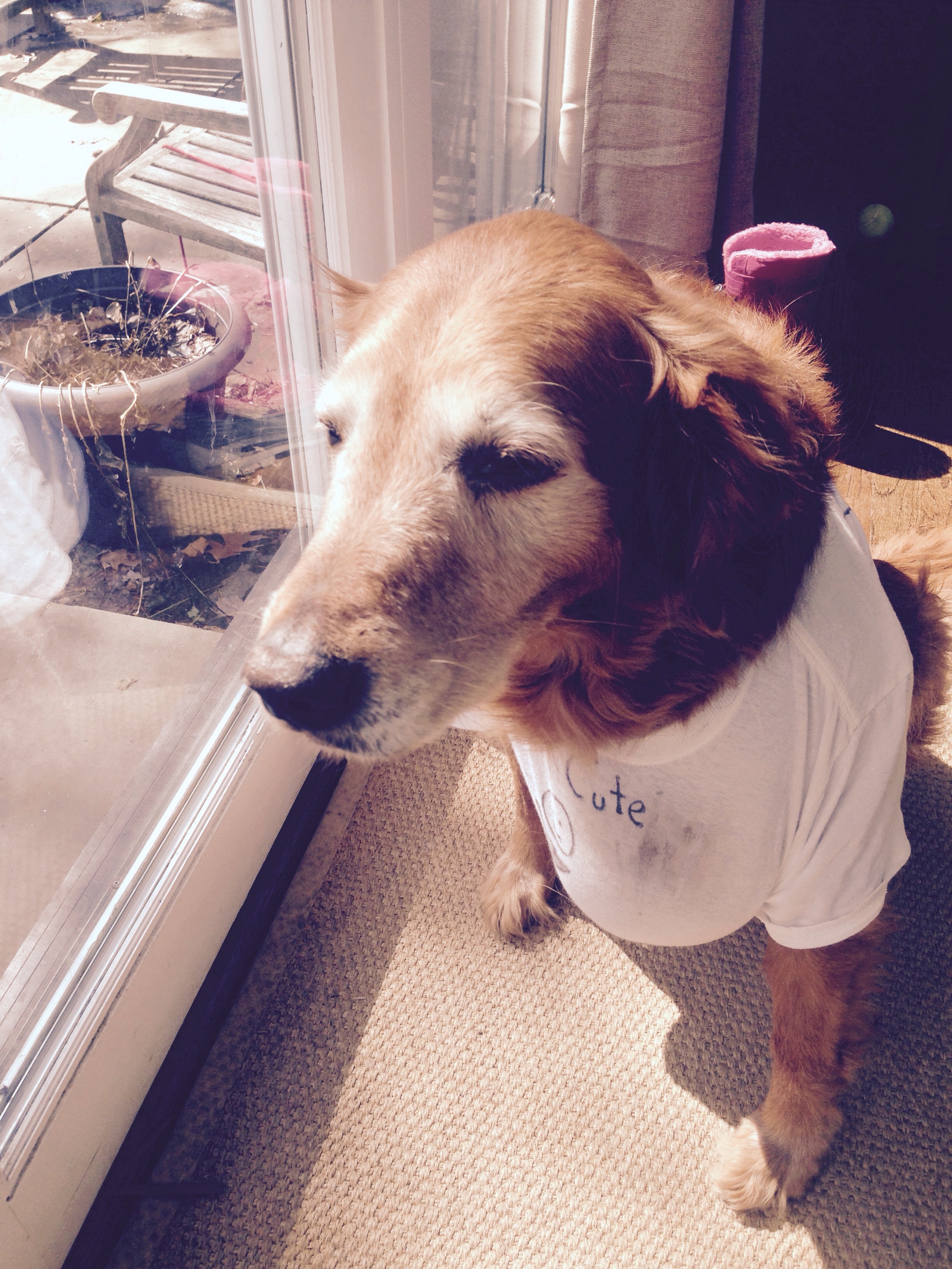 Our 13-year-old puppy, Bailey, exudes loving kindness. He’s also very cute – it says so right on his latest and greatest t-shirt – “I’m cute”.